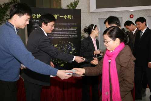 2010年3月26日一早,太平洋保险的志愿者在总部大楼向员工发放“地球一小时”活动宣传资料。