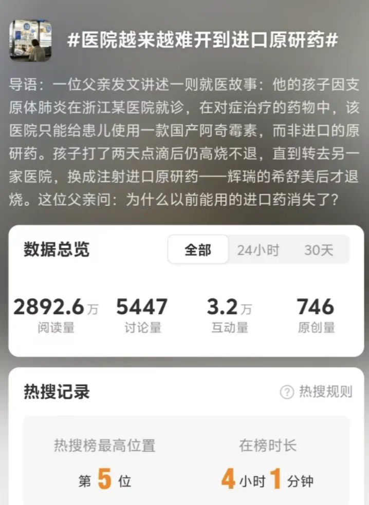 孩子患上了肺炎,公立医院只能开出国产注射型阿奇霉素,连续打了两天仍然高烧不退,进口的阿奇霉素去哪儿了?