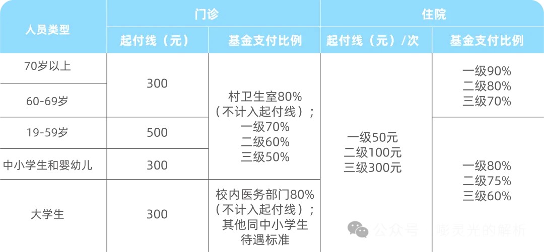 居民医保:全民兜底医保,交得少,政府补得多,门诊比例低,住院起付线高,但覆盖面广,适合学生、老人、自由职业者。