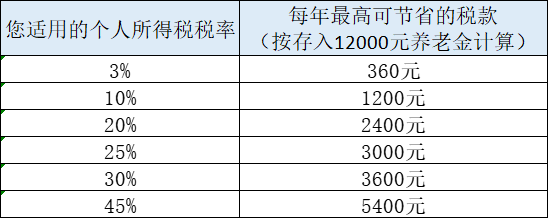 (2)抵扣额度:按实际存入金额抵扣,最高12000元/年。节税金额直接取决于您适用的个人所得税最高税率,具体效果如下表所示: