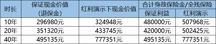 王先生保单利益包括身故保险金或全残保险金,以及红利。其演示利益如下: