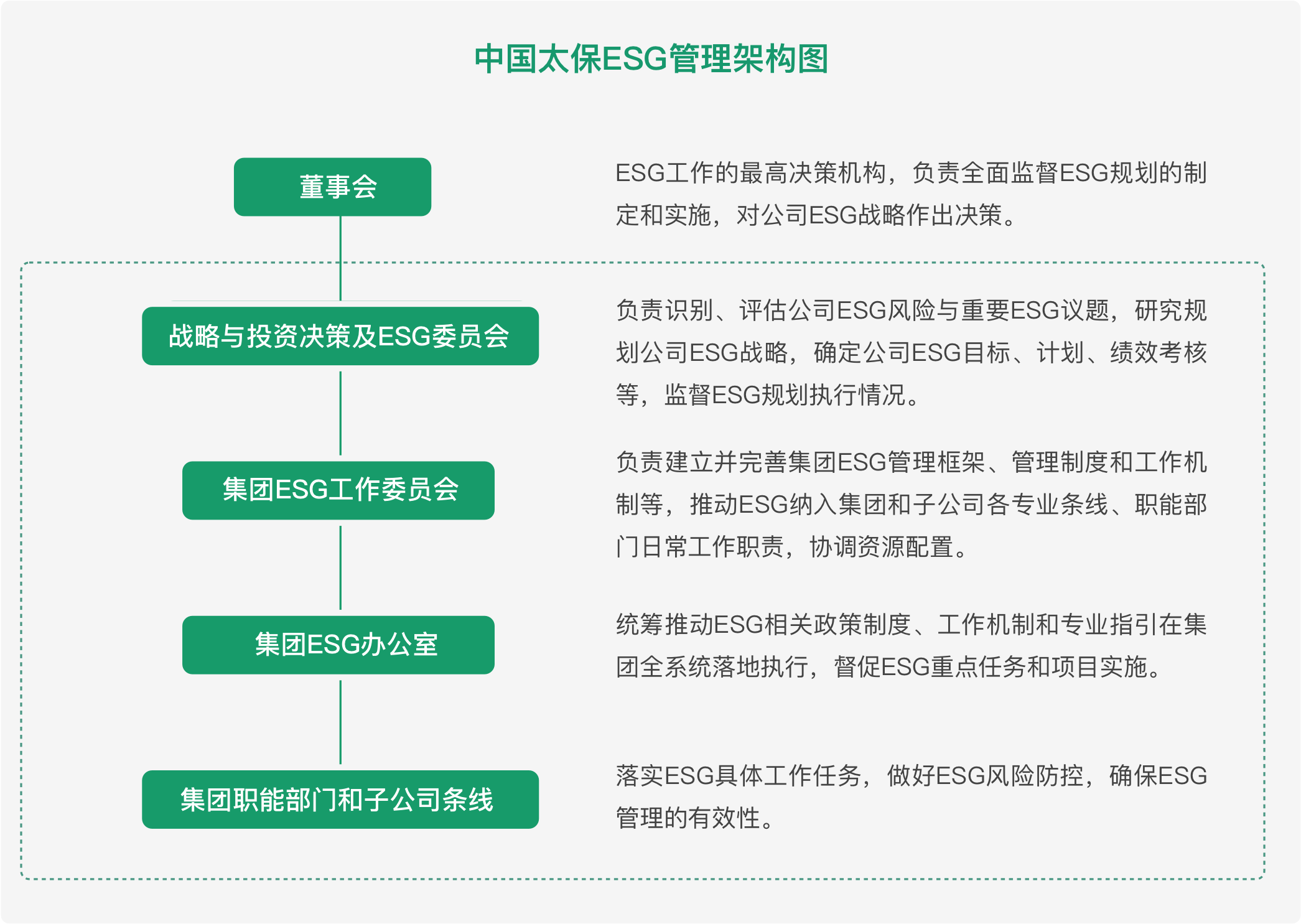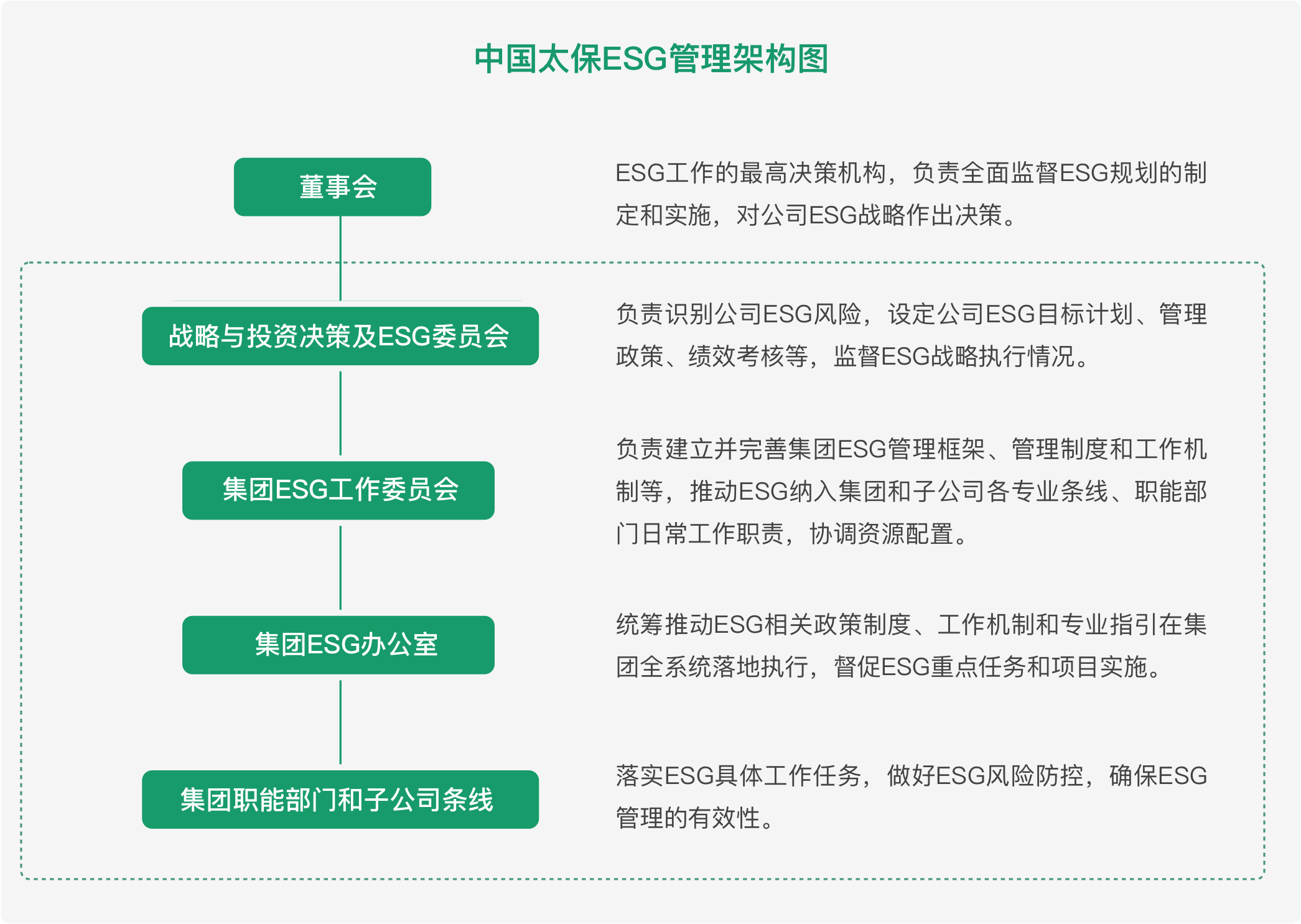 中国太保建立了层次分明、分工明确的“董事会-管理层-执行层”的完整ESG治理架构,为集团自上而下履行ESG实践提供了良好的管理基础和组织保障。中国太保董事会执行董事和管理层的绩效薪酬与ESG指标表现相挂钩。