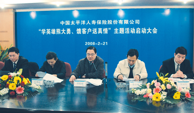 2008年2月21 日,太保寿险召开“学英雄熊大勇,馈客户送真情”主题活动启动大会,寿险公司经营委员会执行委员、销售总监郑韫瑜在会上作了动员和布署,要求广大营销员和 客户服务专员积极行动起来,不仅要学习熊大勇同志忠于保险事业、忠于人民、客户至上的高尚品德,更要以他平日乐于奉献、把客户利益放在首位的先进事迹为楷 模,将点点滴滴的感恩和关爱渗透在每一次为客户服务的具体过程中,充分发挥业务一线人员的桥梁纽带作用,以学英雄送关爱的具体行动再一次向全社会展示太平 洋寿险诚信天下、稳健一生、追求卓越的品牌形象。