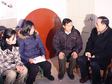 2008年2月5日,太保集团总经理霍联宏冒着严寒赶到熊大勇家中慰问英雄的父 母,代表全体太保干部员工向英雄父母致敬(从右至:霍联宏、英雄父亲、英雄母亲、英雄姐姐)。