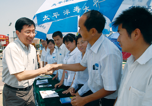 2008年6月3日,太保集团董事长高国富、太保产险常务副总经理许建南、太保寿险经营委员会执行委员兼销售总监郑韫瑜等领导赴陕西慰问员工,检查指导抗