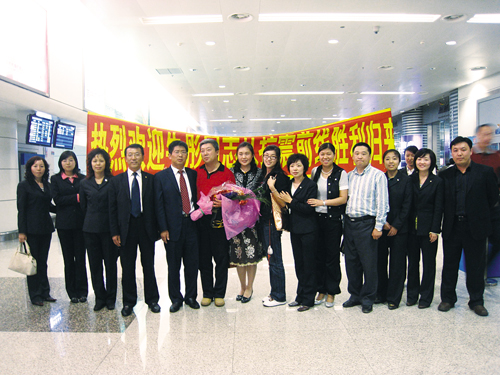 在吉林,吉林分公司总助陈广华带队来到机场,迎接牛彤抗震救灾凯旋而归,让这位东北