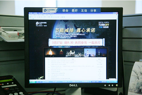 3月中旬,太平洋保险发出了践行“做一家负责任的保险公司”使命,让地球休“熄”一小时的倡议,号召全司员工和客户参与到地球一小时活动中,并统一制作海报,在分支机构在营业场所张贴。3月22日,太平洋保险又开通了“低碳节能、真心承诺”的电子承诺墙,请大家用最环保的形式,留下低碳环保生活的承诺。广大员工积极响应倡议,在留言墙上留下真心承诺,如“节能减排从生活的点点滴滴着手”、“地球是我们共同的家园,让我们携手共建美好家园”,短短2天,已经有几千人留言。