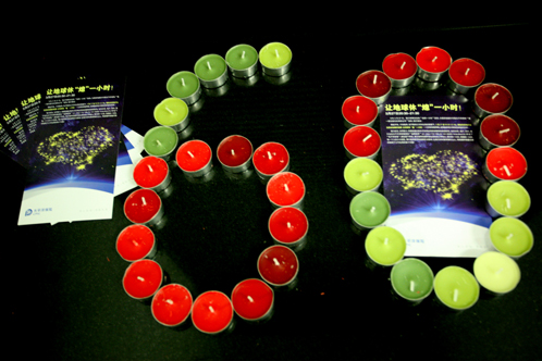 公司为“地球一小时”活动设计制作的宣传单和购买的环保蜡烛。
