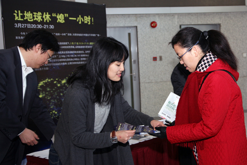 2010年3月26日一早,太平洋保险的志愿者在总部大楼向员工发放“地球一小时”活动宣传资料。