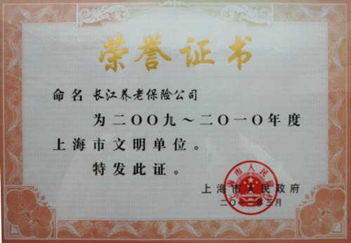 2011年3月份,上海市人民政府命名长江养老保险股份有限公司为“2009—2010”年度(第15届)上海市文明单位。这是长江养老连续第2次获此殊荣,代表了公司精神文明创建的综合成果。