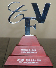公司荣获“2013年度第一财经金融价值榜.年度保险公司(养老金)”奖。第一财经金融价值榜(CBN Fianancial Value Ranking)是由《第一财经日报》发起,整合第一财经全平台之力打造的年度金融行业评选品牌,每年推出具有行业权威性和导向性的竞争力排名,榜单包括“年度金融人物”、“年度经济学家”、“年度金融机构”、“年度金融书籍”、“年度创新金融”、“年度理财品牌”等。“第一财经金融价值榜”已推出六年,榜单权威客观反映中国金融业公司和产品价值,目前已经成长为最具行业权威性和导向性的竞争力榜单之一。
