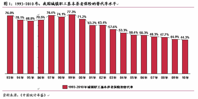 展望未来,在基本养老保险方面,国家将继续扩大基本养老保险的覆盖范围,今年2月份召开的全国社会保险局长会议上提出,“十二五”时期,我国扩大社保覆盖面的重点是非公有制单位职工、灵活就业人员、农民工和农民。其中,新农保将力争在“十二五”期内实现制度的全覆盖。同时,可以预见,国家将在连续七年上调退休金收入水平之后,继续使人均退休金收入水平保持与城镇居民平均工资水平相适应的增长幅度,以使我国基本养老保险的替代率保持在相对稳定的范围内,并争取在2010年44.3%的基础上有所提高,力争保持在45%-50%的理想范围之内。此外,预期国家有关基本养老保险基金提高保值增值能力的政策和措施也会最终出台,从而提高基本养老保险基金的增值速度,提高国家在基本养老保险方面的支付能力。再加上全国社保基金资产的持续增长,我们相信,我国基本养老保险体系最终能实现基本全覆盖,并拥有相对充足的基金积累,为国民的退休生活提供45%-50%的替代率水平。