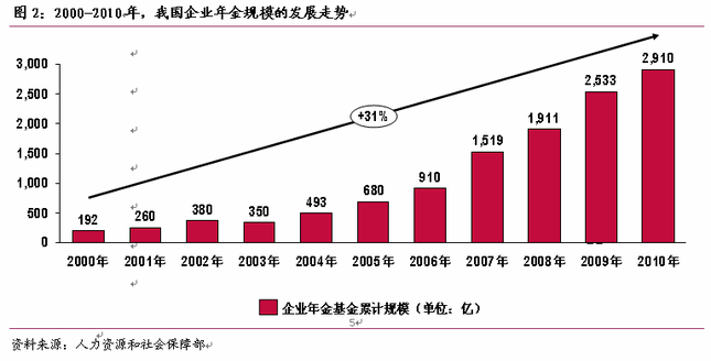 可见,尤其是第二支柱的企业年金是基本养老体系最值得信赖的帮手,能有效减轻基本养老体系在满足国民养老保障需求方面的巨大压力。我国政府早在20年前下发的《关于企业职工养老保险制度改革的决定》中就强调了补充养老保险在多层次养老保障体系建设中的重要地位,国务院在2000年颁布的《关于印发完善城镇社会保障体系试点方案的通知》(国发[2000]42号)中则正式将“补充养老保险”更名为“企业年金”,并同时明确了企业年金采取完全积累制,实行市场化管理运营的发展思路。2004年,原劳动保障部《企业年金试行办法》和《企业年金基金管理试行办法》两个试行办法的颁布及随后出台的多个政策性文件,则基本确立了我国企业年金的制度框架,使我国的企业年金市场在“国家扶持、企业自愿、市场运作、政府监督”的原则下取得了快速发展。截至2010年底,我国企业年金累积规模已达到2910亿元,年均复合增长率达到31%(图2)。
