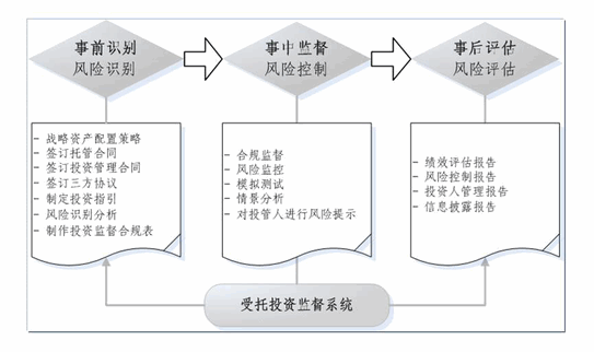 (1)受托投资监督系统,通过科学定性和定量方法有效衡量、监测风险。受托人应形成了一套较为完整、合理的风险指标体系。通过对投资组合进行模拟测试和情景分析,计算投资组合的各项风险指标是否在参考范围内;同时计算各类资产比例、类别是否符合投资指引的要求,监测是否存在关联交易情况等。