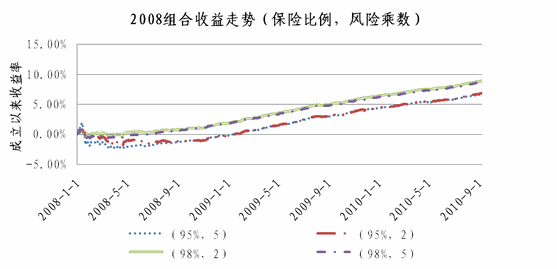 由于2008年权益市场大跌,组合期初无法有效积累安全垫,迫使TIPP策略组合的权益类资产比例持续保持在低位,因而较大程度的避免了权益市场大幅下跌造成的损失。此外,保险比例较高的组合成立以来收益率高于保险比例较低的组合,尤其在2008年市场单边下跌的环境下,该现象更加明显。