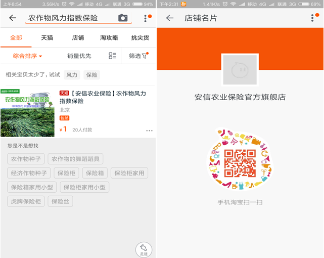 Step1. 登录淘宝搜索农作物风力指数保险,点击至【安信农业保险】农作物风力指数保险投保页面,或扫描下方二维码关注安信农险官方旗舰店进入店铺后搜索,或点击下方链接进入淘宝保险首页,在其下点击”农作物风力指数保险”进入投保页面。