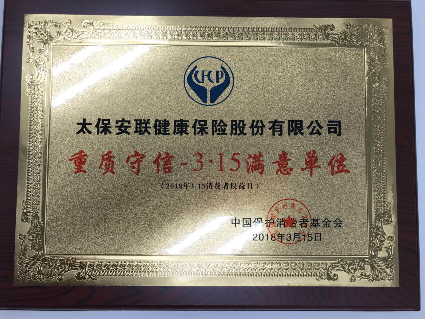 3•15期间,在中国保护消费者权益基金会组织的“重质守信-3•15满意品牌”评选活动中,太保安联健康险荣膺“2018年重质守信-3•15满意单位”。