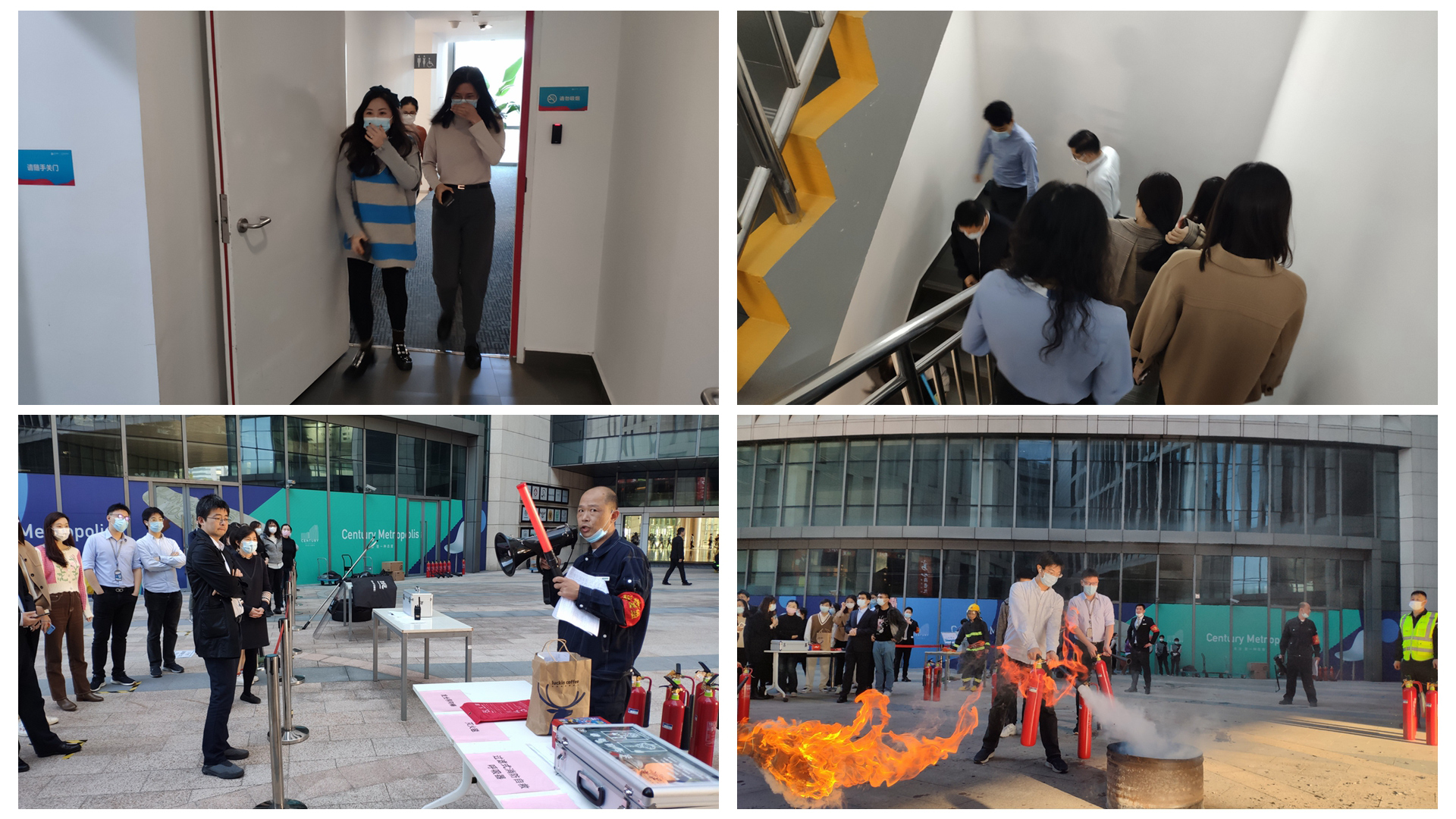 此次演练包括火灾报警、应急撤离、疏散集合、消防操作等主要内容。演练现场,公司参演员工在听到消防警报声后,捂住口鼻,弯腰低姿,在安全管理人员的指引下,迅速有序地从职场各楼层通过消防楼梯撤离,到达应急集合点。随后在专业人员的讲解下具体了解消防知识及灭火器的使用,部分参演人员还实地操作使用灭火器进行灭火扑救。