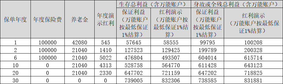 王女士,60周岁,为自己投保了10份“太保鸿寿年年金保险(分红型)”(简称“鸿寿年年”),年交保费100000元,6年交,养老金领取期间选择30年,保险期间为至养老金领取起始日起第三十个合同生效日对应日前一日24时止,基本保险金额21040元,养老金领取方式选择年领,红利领取方式为累积生息。