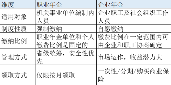 职业年金与企业年金虽然同属我国养老保险体系的第二支柱,但两者在适用对象、制度性质、缴纳比例、管理方式以及领取方式存在不同,具体情况如下: