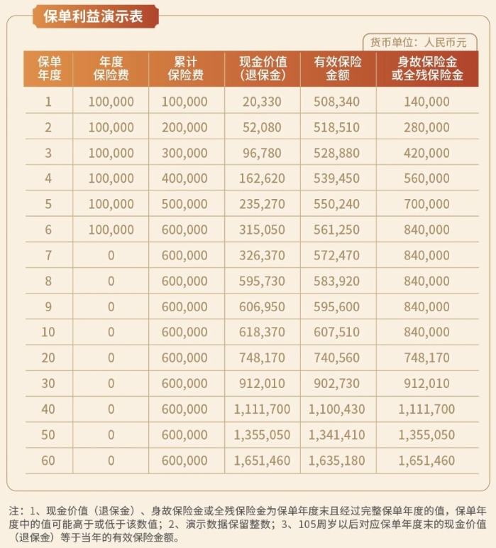 45周岁的王先生为自己投保了“太保盛世传家终身寿险”,选择了6年交,年交保险费100,000元,保险期间终身。