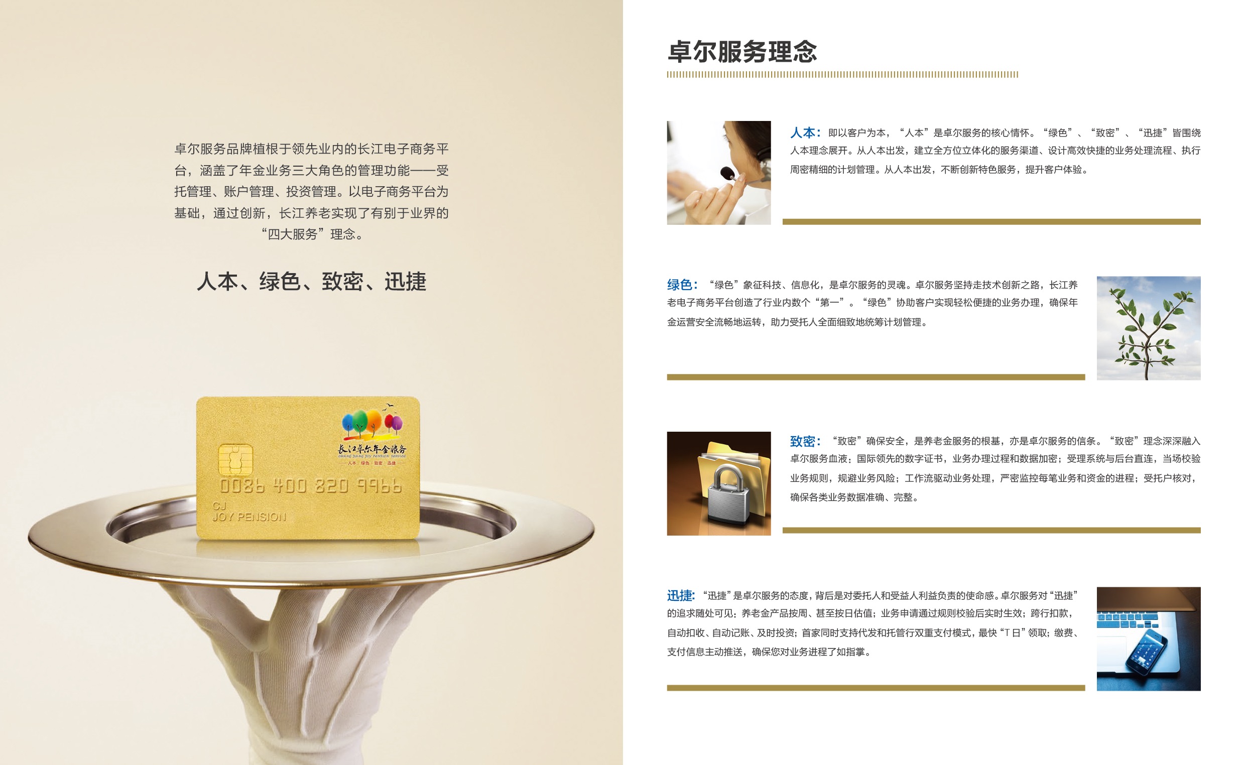 以人为本是卓尔的情怀,绿色科技是卓尔的灵魂,安全致密是卓尔的信条,高效迅捷是卓尔的态度。时光有情,镌刻了卓尔服务的成长,亦坚实了长江人的信仰。长江养老将坚持“受益人利益至上”的经营理念,以坚定信念打造“专业,可信赖,有情怀”的养老金管理公司。卓尔服务将持续以卓越一流的年金服务成就您卓尔不群的管理之术、人才之林、财富之森!