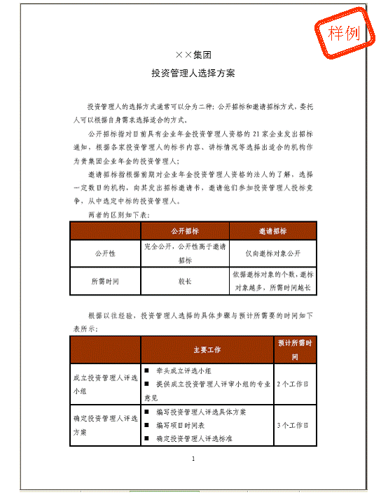 为了协助企业选择合适的投资管理人,我们也提供了投资管理人选择时间表安排、投资管理人选择标准制定、投资管理人标书评审建议等一系列的咨询工作。
