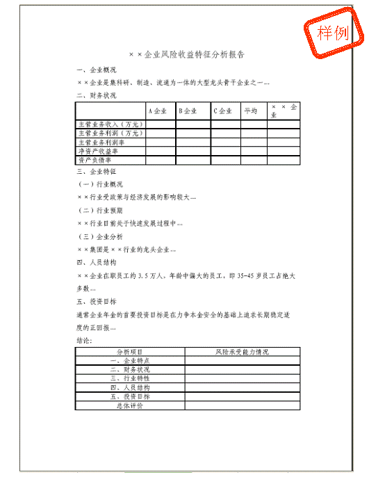 风险收益特征分析将协助您了解您所在企业的风险承受能力,而您企业的风险收益特征即为您确定企业年金投资组合产品的基础,我们将为客户提供详细的风险收益特征分析报告,为理事会进行后续受托投资管理工作提供基础的理论依据。