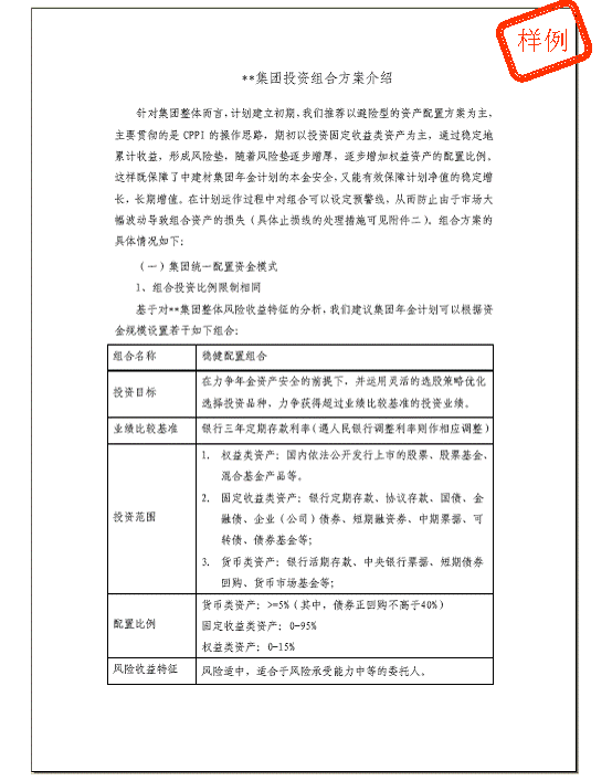 案例:我们曾为一家上海的企业设计过企业年金管理方案。该企业每年有一定比例的人员退休,整体希望获取稳定的资产回报,从而满足退休人员的需求。对此,我们为这家企业作了详细的现金流分析,对未来5年每个月退休人员所需要领取的年金金额进行了详细测算;在现金流测算的基础上,考虑到这家企业极度风险厌恶,我们为其设计的方案中,仅允许投资于存款,并且要求存款到期金额于退休人员所需要领取的年金金额、时点进行匹配,从而较好地满足了客户的需求,且保证了收益的稳定性。