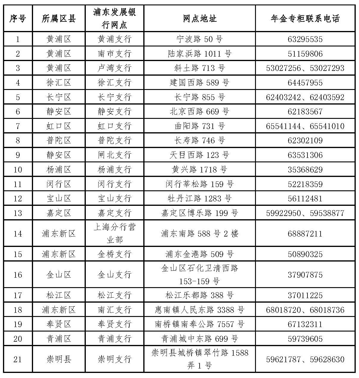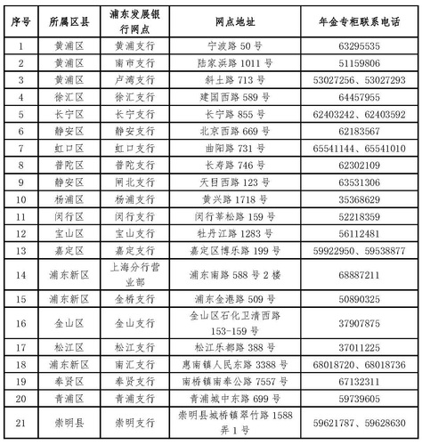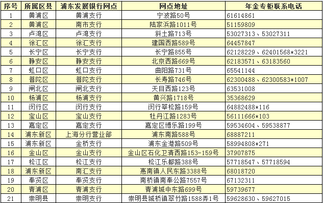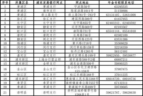 序号 | 所属区县 | 浦东发展银行网点 | 网点地址 | 年金专柜联系电话 |