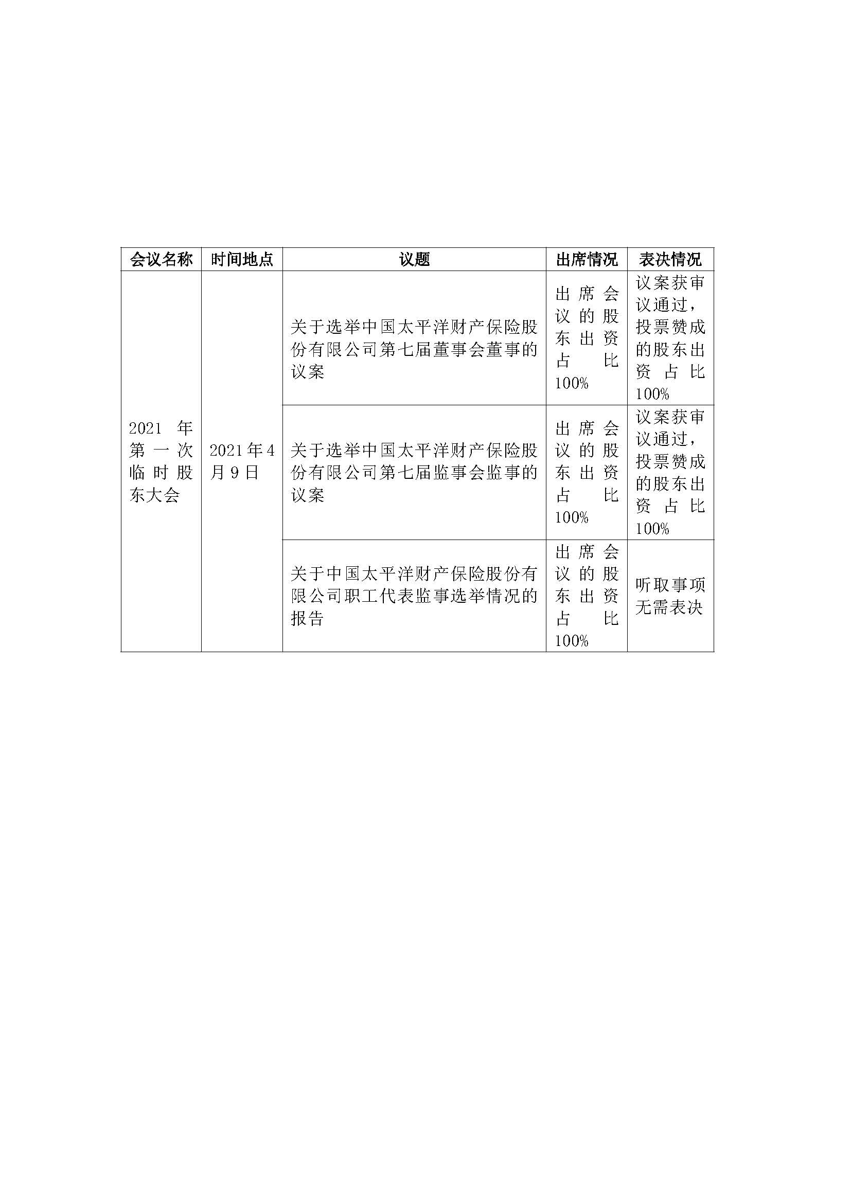 2022年第一次临时股东大会 | 2022年2月16日、上海 | 1. 关于修订《中国太平洋财产保险股份有限公司章程》的议案; 2. 关于修订《中国太平洋财产保险股份有限公司股东大会议事规则》的议案; 3. 关于修订《中国太平洋财产保险股份有限公司董事会议事规则》的议案; 4. 关于修订《中国太平洋财产保险股份有限公司监事会议事规则》的议案; 5. 关于修订《中国太平洋财产保险股份有限公司董事监事履职评价及问责办法》的议案。 | 出席会议的股东出资占比100% | 议案获审议通过,投票赞成的股东出资占比100% |
